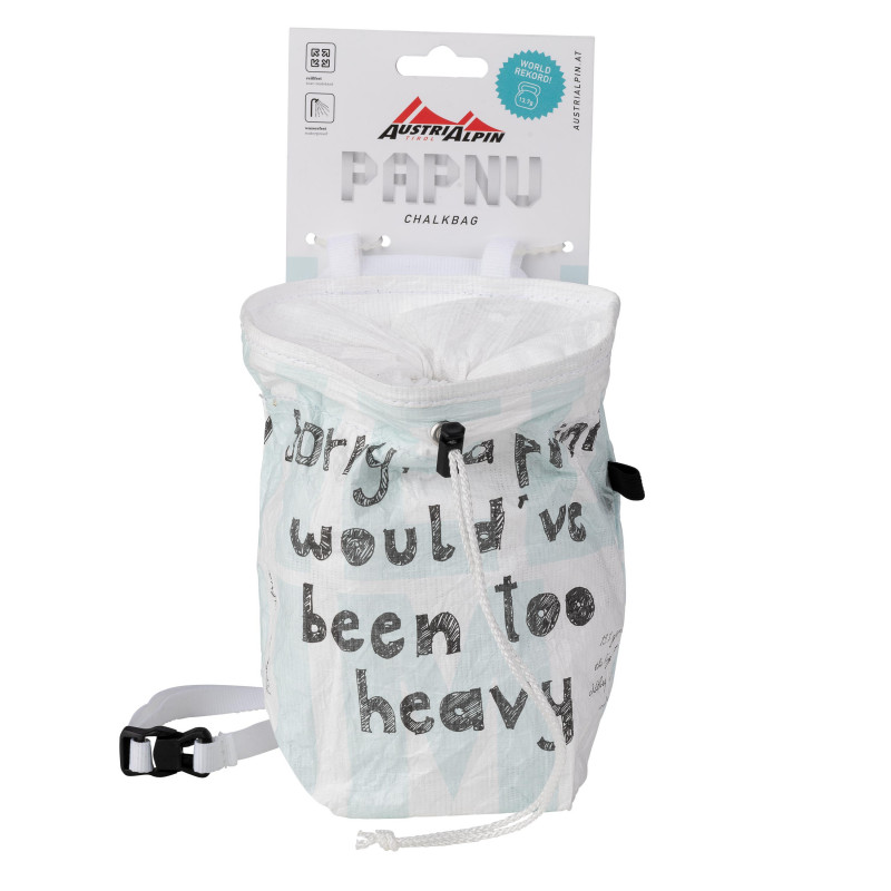 Light. Lighter. PAPNU HELI.UM! These Chalk Bags are not only hip, but with only 13.7 grams (without supplied waist belt; 20g with belt) the absolute light weight among the chalk bags. I mean: These things weigh less than a package of chewing gums!? Made in Austria out of tear-resistant paper we combine function and design for the lightgear junkies among you. Also, the Chalk Bags are 100% vegan and can be washed at 40 degrees celsius in the washing machine. All raw materials for this quality product come from the EU. PAPNU HELI.UM is equipped with a loop for a boulder brush, an adjustable and removable waist belt and two loops to attach to the belt. PAPNU HELI.UM Chalk Bag in white-blue with "sorry, a print would´ve been too heavy"-print: Are you still climbing or already flying?